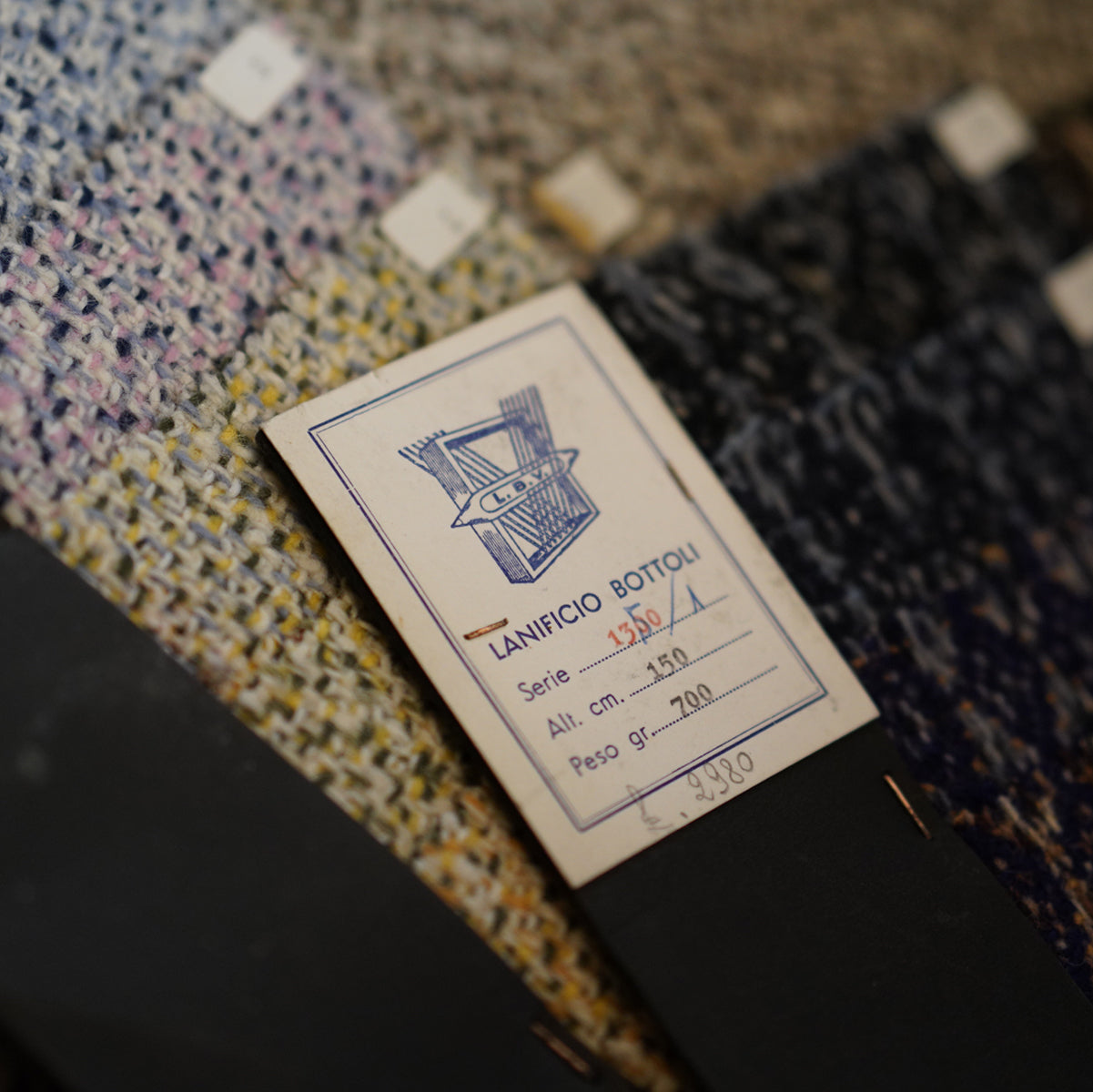 I raccoglitori meticolosamente classificati per tipologia di tessuto ( dalle flanelle, Cheviot, e Saxony degli inizi del 900 ai piu' attuali Lambswool , Sportex e rinnovati Shetland e Tweed) testimoniano la magia e la bellezza di un'arte che in Bottoli viene tramandata da 5 generazioni.